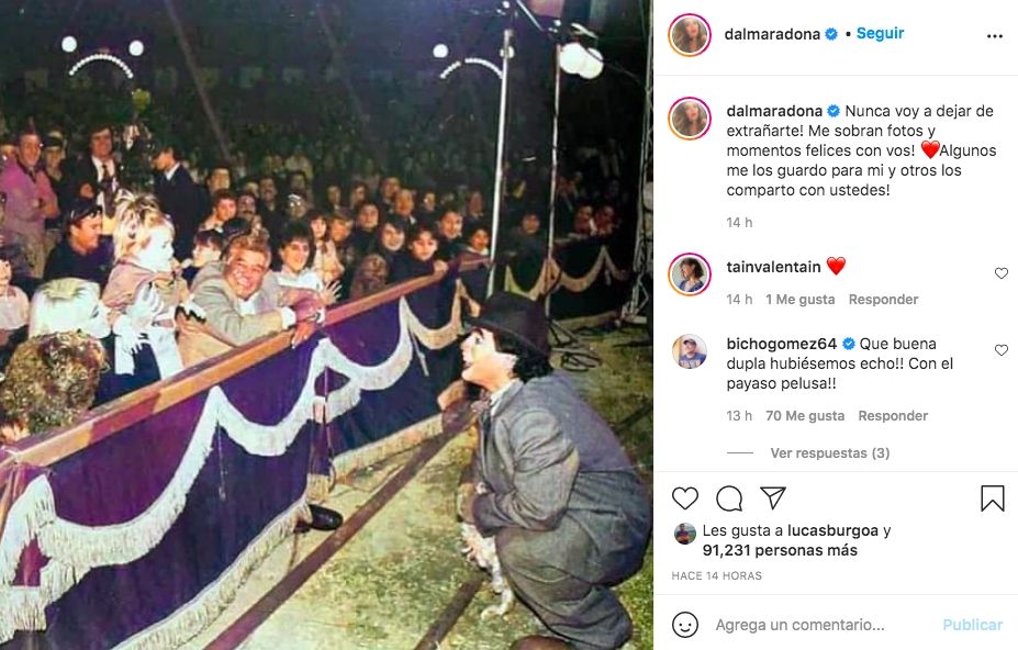 "Nunca voy a dejar de extrañarte! Me sobran fotos y momentos felices con vos! Algunos me los guardo para mi y otros los comparto con ustedes!", escribió junto a una imagen en la que se ve al Diez mirándola en medio de un montón de gente. Conmovida por este gesto, su hermana Gianinna le comentó la publicación: "LOS AMO FUERTE!".