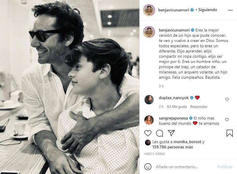 "Eres la mejor versión de un hijo que pude conocer, te veo y vuelvo a creer en Dios. Somos todos especiales, pero tú eres un diferente. Elijo aprender, elijo compartir mi ropa contigo, elijo ser mejor por ti. Eres un hombre niño, un príncipe del trap, un catador de milanesas, un arquero volante, un hijo amigo. Feliz cumpleaños, Bautista", redactó el actor en su cuenta de Instagram.