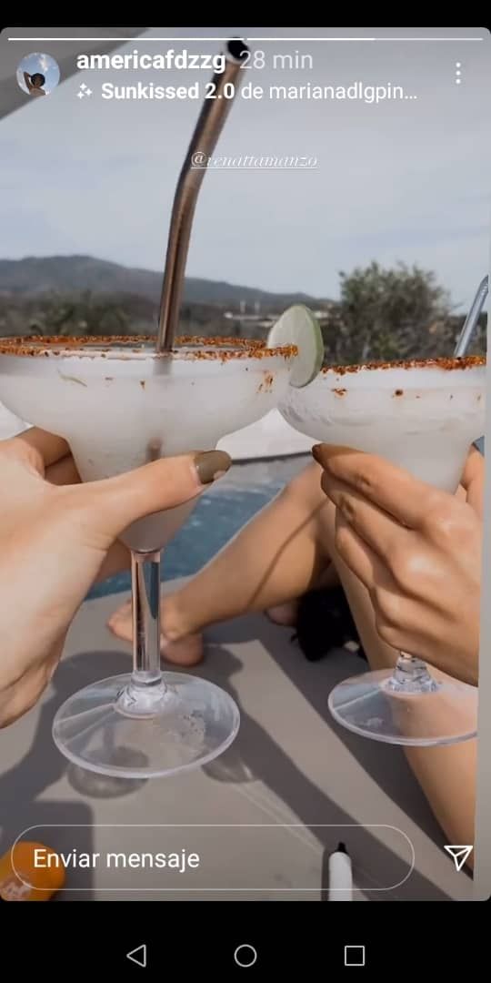 Adicional al material al cual se hace referencia, la joven de 23 años compartió en las historias de su perfil de Instagram un pequeño vídeo donde se puede apreciar que se encuentra al borde de la piscina y está disfrutando de un refrescante cóctel en compañía de otra persona.