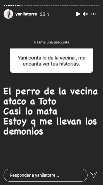 Finalmente, Latorre reveló lo que le sucedió a su mascota. "El perro de mi vecina atacó a Toto. Casi lo mata. Estoy que me llevan los demonios", escribió la mediática.