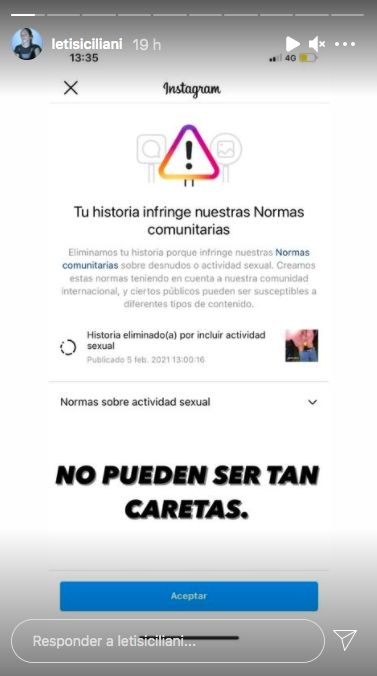 Luego de recibir la adverencia de la red social de que su contenido fue bajado por "incluir actividad sexual", Leticia apuntó sin filtro: "No pueden ser tan caretas".