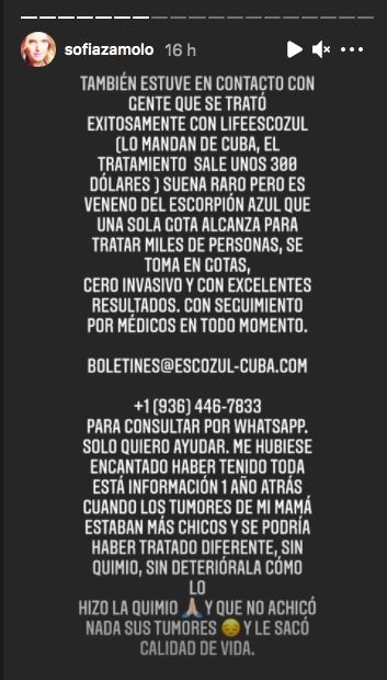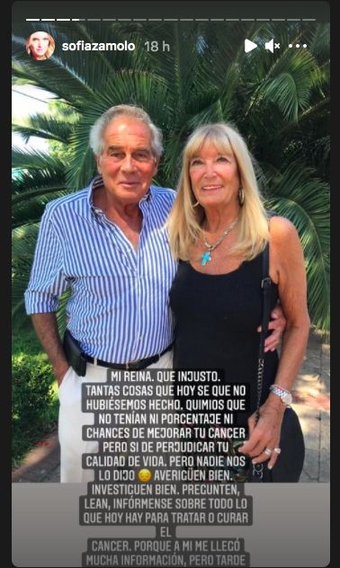 "Mi reina, qué injusto. Tantas cosas que hoy sé que no hubiésemos hecho. Quimios que no tenían ni porcentaje ni chances de mejorar tu cáncer pero sí de perjudicar tu calidad de vida", lamentó Sofía. "Pero nadie nos lo dijo. Averigüen bien, investiguen bien. Pregunten, lean, infórmense sobre todo lo que hoy hay para tratar o curar el cáncer, porque a mí me llegó mucha información pero tarde", reflexionó.