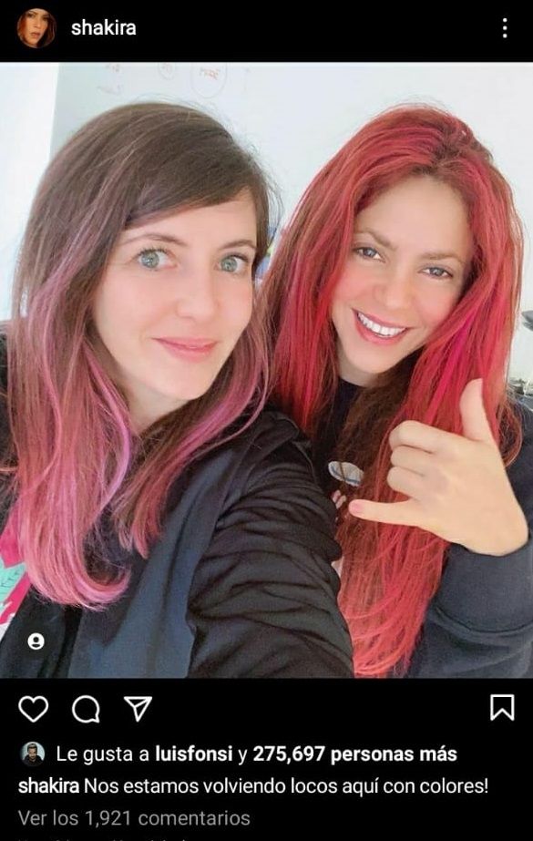 Hace algunas horas atrás Shakira compartió en su perfil de Instagram una imagen de ella junto a su amiga, la artista Sofia Leclair. Allí se las puede ver a ambas lucir sus impactantes colores de pelo. Además la pareja del jugador español agregó un comentario que dice así: "We are going nuts here with colors!" (Nos estamos volviendo locos aquí con colores). Entre las miles de reacciones que tuvo dicho posteo se encuentra la del famoso cantante Luis Fonsi que también reaccionó con un like.