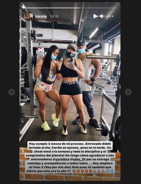 Además de dicha fotografía, Karol G, escribió un mensaje que dice lo siguiente: "Hoy cumplo 3 meses de mi proceso. Entrenando doble jornada al día; cardio en ayunas, peso en la tarde. Un cheat meal a la semana y tda la disciplina y el compromiso del planeta! No tengo cómo agradecer a mis entrenadores Yarishna Ayala y Luis Ojeda por su entrega conmigo y acompañarme a todos lados... Hoy empieza mi fase 3 (voy por mis abs). Dale pues tú también que dijiste que este era tu año!!!".