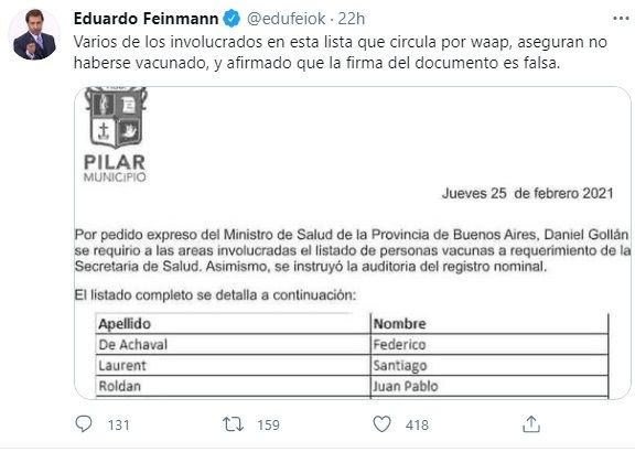 Feinmann no salió a responderle a su colega, por el contrario, optó por borrar la publicación que generó el enojo. Minutos más tarde volvió a subirla a la red social del pajarito y resaltó el nombre de Brancatelli. "Varios de los involucrados en esta lista que circula por WhatsApp, aseguran no haberse vacunado, y afirmado que la firma del documento es falsa", redactó.