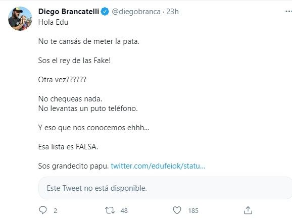 "Hola Edu. No te cansás de meter la pata. ¡Sos el rey de las Fake! ¿Otra vez? No chequeás nada", redactó en Twitter el periodista de América TV citando la publicación del flamante conductor de La Nación +. "No levantas un p*** teléfono. Y eso que nos conocemos eh", agregó indignado. "Esa lista es falsa. Sos grandecito, papu", cerró.