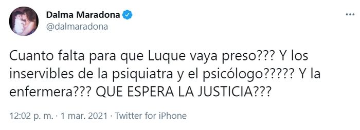 "Cuanto falta para que Luque vaya preso??? Y los inservibles de la psiquiatra y el psicólogo????? Y la enfermera??? QUE ESPERA LA JUSTICIA???", escribió en un mensaje.
