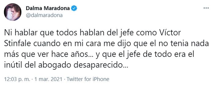 Y agregó: "Ni hablar que todos hablan del jefe como Víctor Stinfale cuando en mi cara me dijo que el no tenia nada más que ver hace años... y que el jefe de todo era el inútil del abogado desaparecido...".