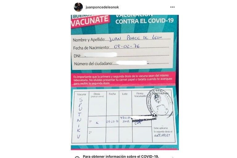 En esta oportunidad, las miradas apuntaron hacia Juan Ponce de León, el recordado protagonista de Verano del ’98, quien publicó en su cuenta de Instagram un certificado de vacunación de la Sputnik V.