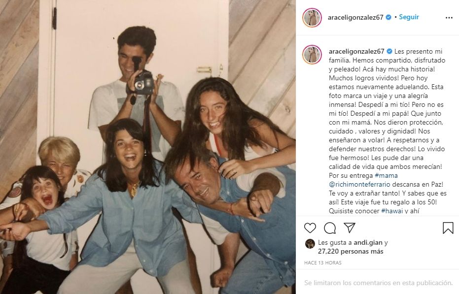 Angustiada, la actriz posteó un tierno retrato familiar y se refirió con ternura a "Puchi", a quien consideraba su papá. "Les presento mi familia. Hemos compartido, disfrutado y peleado. ¡Acá hay mucha historia! Muchos logros vividos. Pero hoy estamos nuevamente aduelando. Esta foto marca un viaje y una alegría inmensa... Despedí a mi tío pero no es mi tío, despedí a mi papá... Que junto con mi mamá nos dieron protección, cuidado, valores y dignidad... ¡Nos enseñaron a volar! A respetarnos y a defender nuestros derechos", expresó.