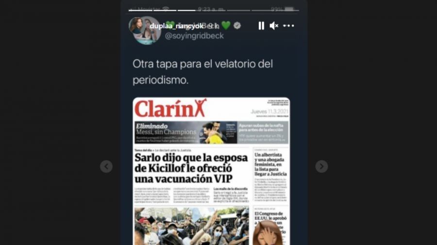 Por su lado, Nancy Dupláa, esposa de Echarri, también se sumó a la controversia posteando una primera plana el diario Clarín. “Otra tapa para el velatorio del periodismo”, escribió la actriz acompañando la imagen del titular que rezaba: “Sarlo dijo que la esposa de Kicillof le ofreció una vacunación VIP”.