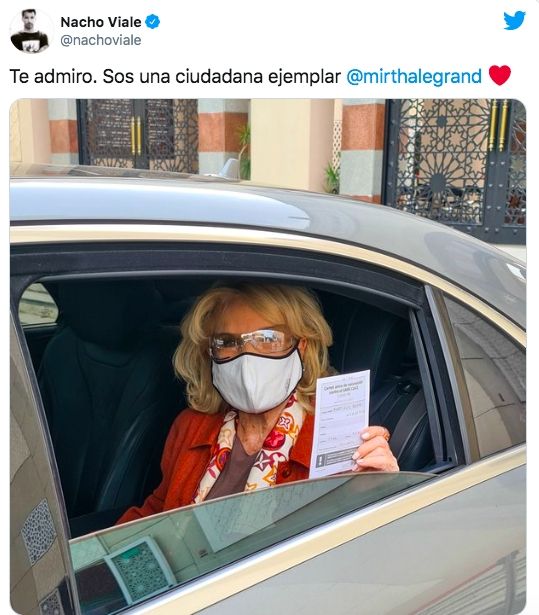 La noticia se conoció minutos después de las 16, cuando la diva salió del vacunatorio ubicado en Palermo. Orgulloso de haber contribuido a que su abuela pudiera vacunarse, Viale recurrió a las redes sociales para celebrar. "Te admiro. Sos una ciudadana ejemplar", escribió junto a una fotografía en la que se puede ver a Mirtha con el certificado de la primera dosis de la Sputnik V en mano.