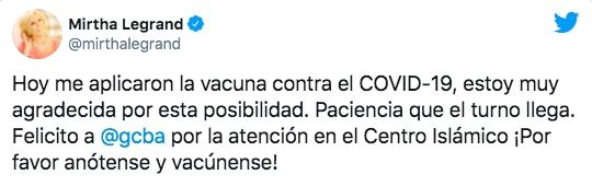 "Hoy me aplicaron la vacuna contra el COVID-19, estoy muy agradecida por esta posibilidad. Paciencia que el turno llega. Felicito al gobierno de la ciudad de Buenos Aires por la atención en el Centro Islámico ¡Por favor anótense y vacúnense!", escribió en Twitter.