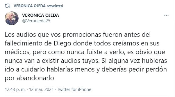 "Los audios que vos promocionas fueron antes del fallecimiento de Diego donde todos creíamos en sus médicos. Como nunca fuiste a verlo, es obvio que nunca van a existir audios tuyos. Si alguna vez hubieras ido a cuidarlo, seguramente hablarías menos y estarías pidiendo perdón", disparó sin filtro la mamá de Dieguito Fernando.