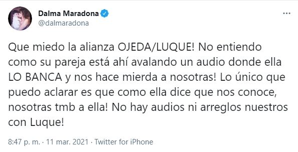 "Qué miedo la alianza Ojeda/Luque. No entiendo como su pareja está ahí avalando un audio donde ella lo banca y nos hace mierda a nosotras. Lo único que puedo aclarar es que como ella dice que nos conoce, nosotras también a ella. No hay audios ni arreglos nuestros con Luque", fue el mensaje que publicó Dalma Maradona en su cuenta de Twitter para despegarse de los nuevos audios que se filtraron, esta vez de Verónica Ojeda con Leopoldo Luque.