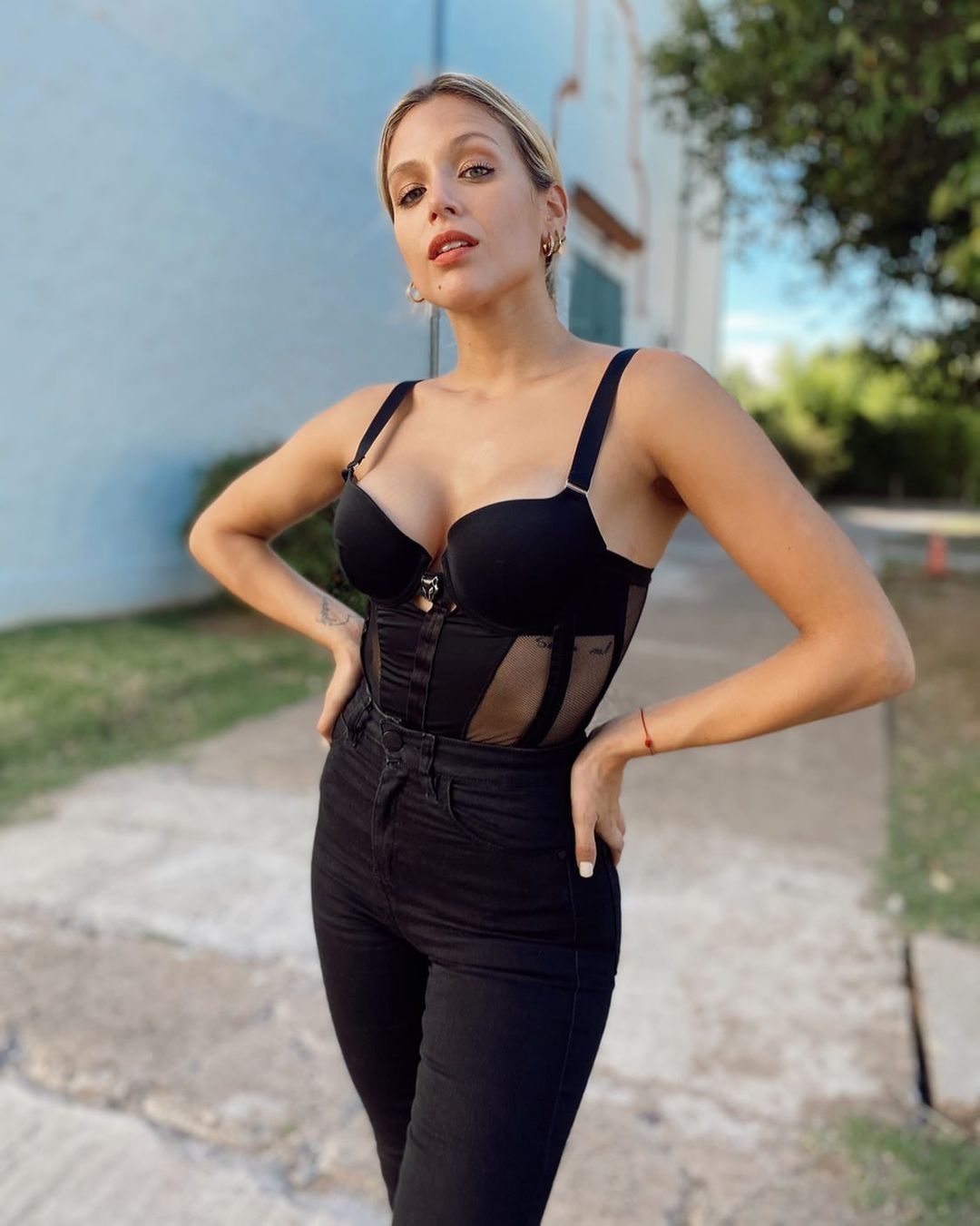 "Me quise sumar a la moda del corset y me siento rarísima. ¿Alguien más?", escribió en sus historias de Instagram, junto a una postal donde se la ve frente al espejo con un conjunto negro. La hija de Nazarena Vélez optó por un pantalón ajustado negro y lo combinó con un corset con escote y transparencias.