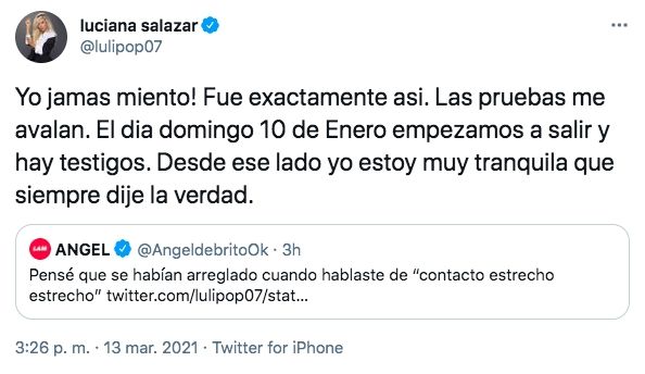 Rápidamente, el conductor de Los ángeles de la mañana, por ElTrece, no dudó en consultarle: "No entiendo lo de ‘apretándome’". Y Luciana respondió: "La palabra fue ‘arreglamos todo o no arreglamos nada’". "Pensé que se habían arreglado cuando hablaste de ‘contacto estrecho estrecho’", comentó el periodista. "¡Yo jamás miento! Fue exactamente así. Las pruebas me avalan. El día domingo 10 de enero empezamos a salir y hay testigos. Desde ese lado yo estoy muy tranquila que siempre dije la verdad", respondió Salazar.