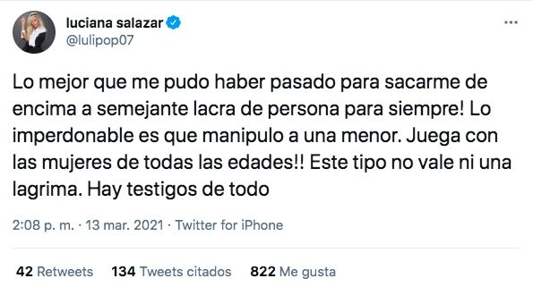 Luego, agregó: "Lo mejor que me pudo haber pasado para sacarme de encima a semejante lacra de persona para siempre. Lo imperdonable es que manipuló a una menor. Juega con las mujeres de todas las edades. Este tipo no vale ni una lágrima. Hay testigos de todo".