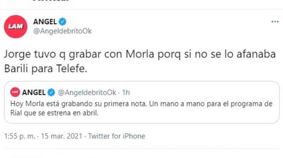 En las últimas semanas, Rial ha generado un gran misterio alrededor del nombre del primer invitado a su nuevo ciclo, Tv Nostra. Finalmente, este lunes, la intriga desapareció. De Brito a través de su cuenta de Twitter reveló: "Hoy Morla está grabando su primera nota. Un mano a mano para el programa de Rial que se estrena en abril", escribió el conductor.