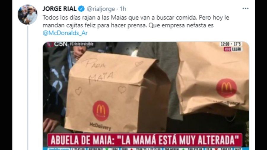 “Todos los días rajan a las Maias que van a buscar comida. Pero hoy le mandan cajitas feliz para hacer prensa. Que empresa nefasta es McDonald's Argentina”, escribió el periodista en su cuenta de Twitter.