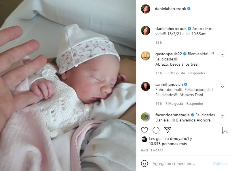 "¡Amor de mi vida! 18/3/21 a las 10:33am", redactó la intérprete de 'Sólo tus canciones'. La publicación se llenó de mensajes de bienvenida para la pequeña y de felicitaciones para sus padres. Entre ellos se destacan los comentarios de varias figuras del medio artístico. Gastón Pauls, Sandra Mihanovich, Tomás Fonzi, Facundo Arana y Laura Cymer son algunos de los que le escribieron.