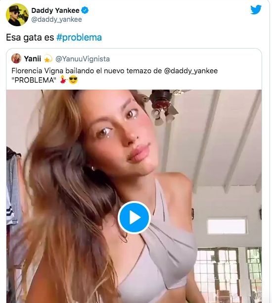 Ni bien una seguidora de Flor compartió el video a través de Twitter, llegó hasta el artista, que al ver a la actriz y cantante bailando su hit, Yankee le hizo RT y le dedicó un picante mensaje. "Esa gata es problema", sentenció. Acto seguido, Flor replicó la respuesta de Daddy.