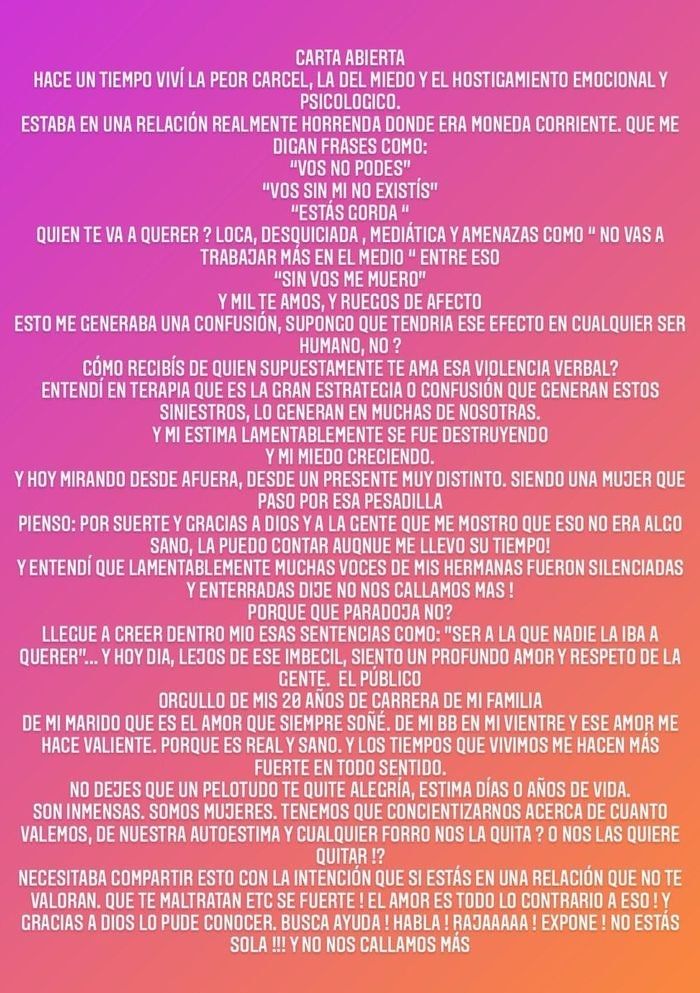 Luego agregó conmovida: "Entre eso 'sin vos me muero' y miles de 'te amo' y ruegos de afecto. Esto me generaba una confusión, supongo que tendría ese efecto en cualquier ser humano. ¿Cómo recibís de quién supuestamente te ama esa violencia verbal? Entendí en terapia que es la estrategia que generan estos siniestros, lo generan en muchas de nosotras. Y mi estima lamentablemente se fue destruyendo, y mi miedo fue creciendo. Hoy mirando desde afuera, desde un presente muy distinto, siendo una mujer que pasó por esa pesadilla, pienso: por suerte y gracias a Dios y la gente que me mostró que eso no era algo sano la puedo contar, aunque me llevó su tiempo".