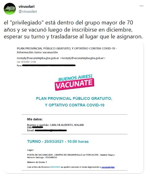 "El 'privilegiado' está dentro del grupo mayor de 70 años y se vacunó luego de inscribirse en diciembre, esperar su turno y trasladarse al lugar que le asignaron", manifestó Virginia.