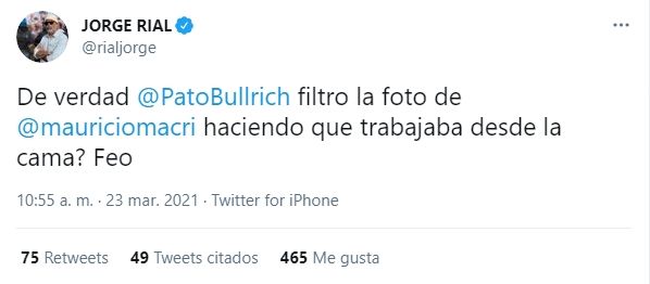 "¿De verdad Pato Bullrich filtró la foto de Mauricio Macri haciendo que trabajaba desde la cama? Feo", lanzó el exconductor de Intrusos en el espectáculo desde su cuenta de Twitter, generando polémica instantánea.