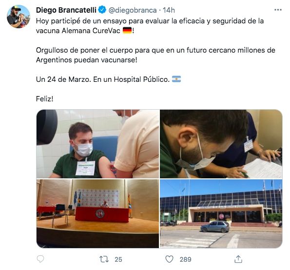 Diego Brancatelli se mostró muy activo en Twitter durante el 24 de marzo. Primero para hacerles un reclamo a Alberto Fernández y Cristina Fernández de Kirchner con motivo del Día de la Memoria, Verdad y Justicia, y luego para revelar que se presentó como voluntario para vacunarse contra el Covid-19 con la vacuna alemana CureVac.
