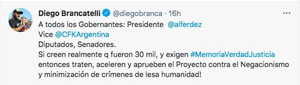 "A todos los gobernantes: Presidente @alferdez. Vice @CFKArgentina. Diputados, Senadores. Si creen realmente que fueron 30 mil, y exigen memoria, verdad y justicia; entonces traten, aceleren y aprueben el Proyecto contra el Negacionismo y minimización de crímenes de lesa humanidad", redactó el panelista de Intratables en la red social del pajarito.