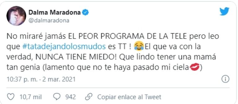 Una de ellas fue la de Dalma Maradona que salió a respaldar a su mamá. "¡No miraré jamás el peor programa de la tele, pero leo que #TataDejándolosMudos es TT! ¡El que va con la verdad nunca tiene miedo! Qué lindo tener una mamá tan genia (lamento que no te haya pasado, mi ciela)", escribió en su cuenta de Twitter.