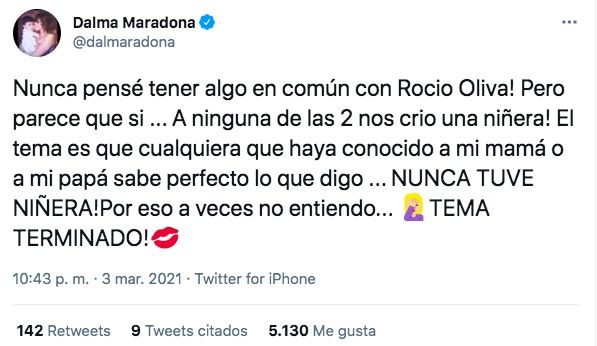 Una vez más, Dalma recogió el guante y recurrió a su cuenta de Twitter: "¡Nunca pensé tener algo en común con Rocío Oliva! Pero parece que sí... ¡A ninguna de las dos nos crió una niñera! El tema es que cualquiera que haya conocido a mi mamá o a mi papá sabe perfecto lo que digo: nunca tuve niñera", escribió, dando por terminado el tema.