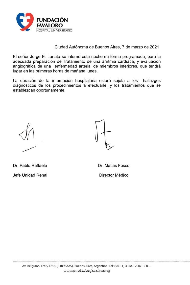 "El señor Jorge E. Lanata se internó esta noche en forma programada, para la adecuada preparación del tratamiento de una arritmia cardíaca, y evaluación angiográfica de una enfermedad arterial de miembros inferiores, que tendrá lugar en las primeras horas de mañana lunes. La duración de la internación hospitalaria estará sujeta a los hallazgos diagnósticos de los procedimientos a efectuarle, y los tratamientos que se establezcan oportunamente”, explican.