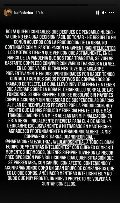 "Hola. Quiero contarles que después de pensarlo mucho, ya que no era una decisión fácil de tomar, he resuelto -en común acuerdo con la producción de la obra- no continuar con mi participación en Mentiras inteligentes. Los motivos tienen que ver con que actualmente, en el marco de la pandemia que nos toca transitar, se vuelve bastante complejo convivir con varios trabajos a la vez", comenzó su texto.