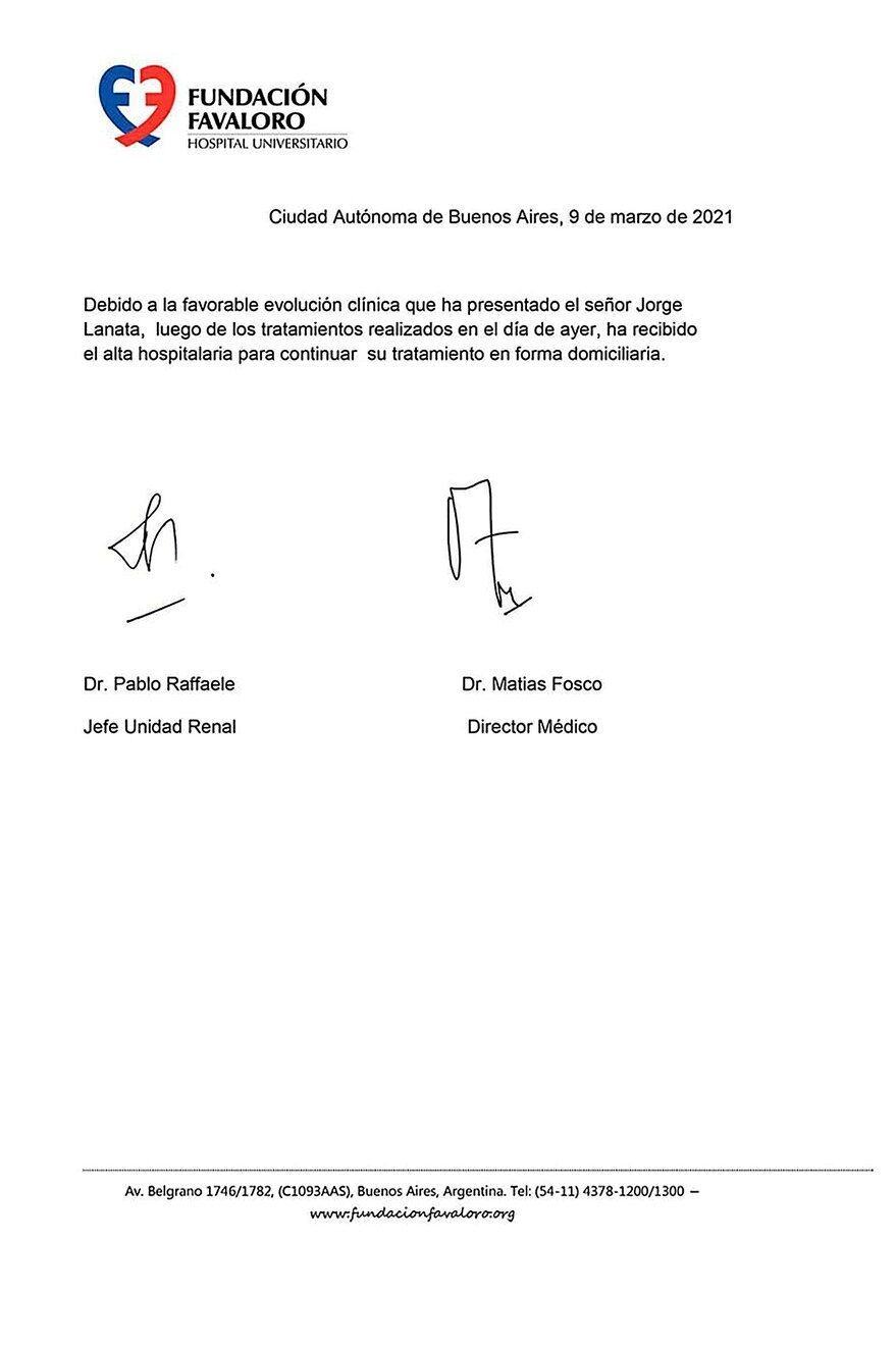 Este lunes, se dio a conocer que la angioplastia que le practicaron al conductor Jorge Lanata tuvo un resultado exitoso. Y ahora, a 48 horas de su internación, fue dado de alta. El comunicado de la Fundación Favaloro indica: “Debido a la favorable evolución clínica que ha presentado el señor Jorge Lanata, luego de los tratamientos realizados en el día de ayer, ha recibido el alta hospitalaria para continuar su tratamiento en forma domiciliaria”.