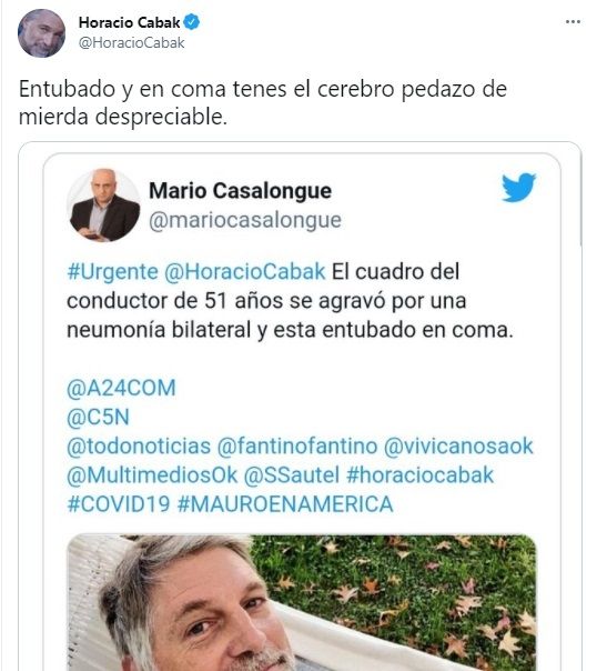 Al ver esto, Cabak salió con furia a responder. "Entubado y en coma tenés el cerebro pedazo de m**** despreciable", escribió sin filtro.