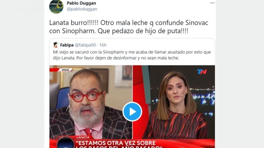 Tras las fallidas declaraciones de Lanata, su colega Pablo Duggan estalló en la red: “¡Lanata burro! Otro mala leche que confunde Sinovac con Sinopharm ¡Qué pedazo de hijo de p*ta!”, enfatizó el conductor de C5N.