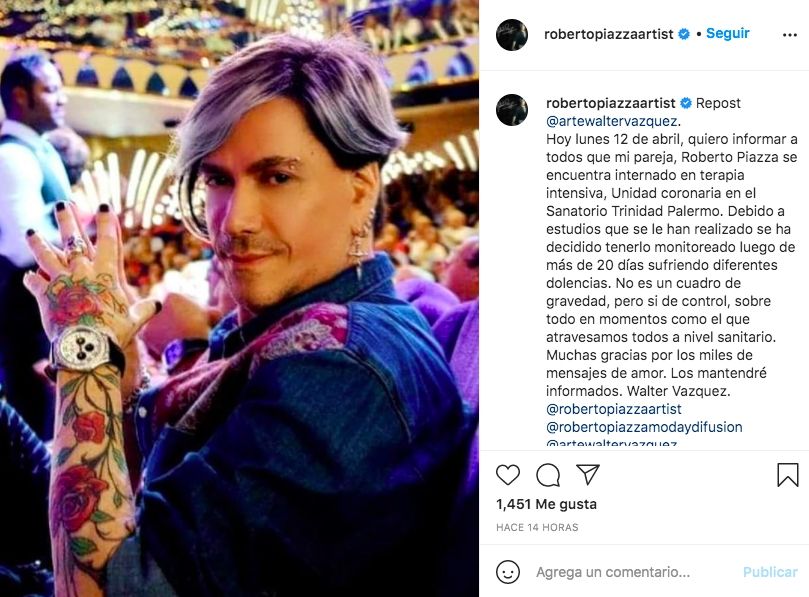 "Hoy lunes 12 de abril, quiero informar a todos que mi pareja, Roberto Piazza se encuentra internado en terapia intensiva, Unidad coronaria en el Sanatorio Trinidad Palermo. Debido a estudios que se le han realizado se ha decidido tenerlo monitoreado luego de más de 20 días sufriendo diferentes dolencias", precisó Walter.