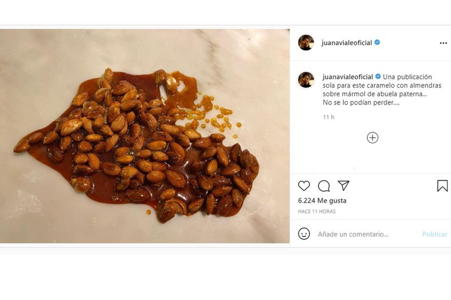 Esta vez, fue el turno de unas almendras acarameladas, y lo que más sorprendió fue la forma en que mostró el resultado final. “Una publicación sola para este caramelo con almendras sobre el mármol de abuela paterna. No se lo podían perder”, contó en Instagram. En la imagen se puede ver el praliné que preparó, directamente sobre la mesada. Se trata de una técnica muy utilizada en la gastronomía, ya que la superficie resiste la temperatura y de esa manera se corta la cocción de los ingredientes, a diferencia de hacerlo sobre la olla con el calor residual todavía presente.