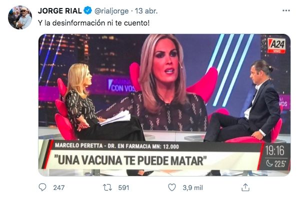 En ese contexto, el conductor de TV Nostra, cruzó a la periodista a través de su cuenta de Twitter. Con una captura de imagen del ciclo de Canosa, en donde a través de un zócalo se puede leer la confesión del secretario sindical: "Una vacuna te puede matar". "Y la desinformación ni te cuento", concluyó Rial.