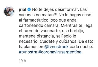 El conductor de América extendió su mensaje en sus redes sociales, donde arremetió: "No te dejes desinformar. Las vacunas no matan!!! No le hagas caso al farmacéutico loco que anda cartoneando cámara. Mientras te llega el turno de vacunarte, usa barbijo, mantene distancia, salí solo lo necesario. Cuídate y cuídanos. De esto hablamos en @tvnostraok cada noche. #tvnostra #coronavirusargentina".