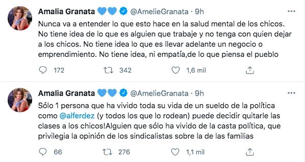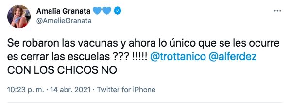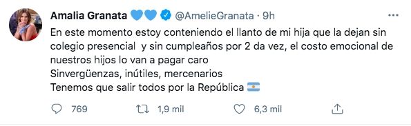 Por su parte, Amalia Granata hizo su descarga apelando a una escena familiar: "En este momento estoy conteniendo el llanto de mi hija que la dejan sin colegio presencial y sin cumpleaños por segunda vez, el costo emocional de nuestros hijos lo van a pagar caro. Sinvergüenzas, inútiles, mercenarios. Tenemos que salir todos por la República". Minutos más tarde, siguió descargándose: "CON LOS CHICOS NOOOOOO", con textuales mayúsculas.