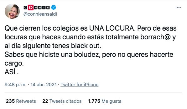 "Nooo las clases no", expresó Lourdes Sánchez. "Que cierren los colegios es UNA LOCURA. Pero de esas locuras que haces cuando estás totalmente borrach@ y al día siguiente tenes black out. Sabes que hiciste una boludez, pero no queres hacerte cargo. ASÍ", expresó Connie Ansaldi.