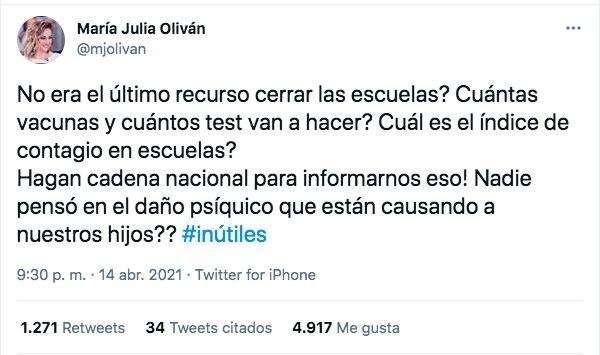 "¿No era el último recurso cerrar las escuelas? Cuántas vacunas y cuántos test van a hacer? Cuál es el índice de contagio en escuelas? Hagan cadena nacional para informarnos eso! Nadie pensó en el daño psíquico que están causando a nuestros hijos??", dijo María Julia Oliván.
