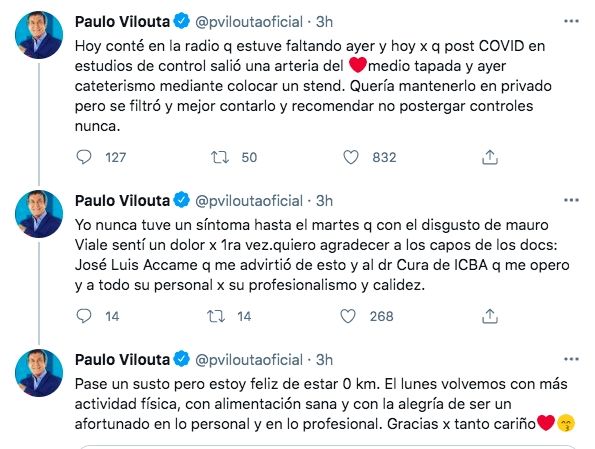 "Hoy conté en la radio que estuve faltando ayer y hoy porque post COVID-19 en estudios de control salió una arteria del medio tapada y ayer, cateterismo mediante me colocaron un stent. Quería mantenerlo en privado pero se filtró y mejor contarlo y recomendar no postergar controles nunca", escribió el periodista en su cuenta de Twitter.