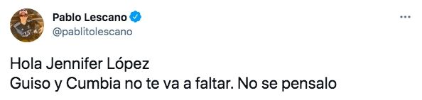 Enterado de la noticia, Pablo Lescano aprovechó la ocasión para hacerle una propuesta a la cantante. "Hola Jennifer Lopez. Guiso y Cumbia no te va a faltar. No sé, pensalo", escribió en su cuenta de Twitter, y publicó junto al mensaje una foto suya comiendo guiso de lentejas y abrazando a su perro.