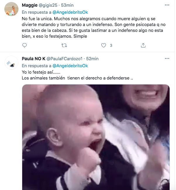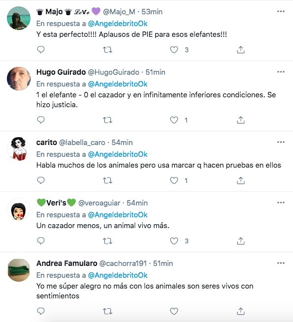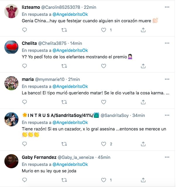Esta vez, fiel a su estilo, la actriz compartió la noticia de que un cazador había fallecido tras ser pisado por varios elefantes. "Cazador muere pisoteado por elefantes" decía el titular de la nota. Al posteo, le agregó un GIF de un hombre celebrando y bailando por la noticia.