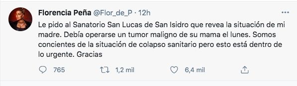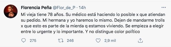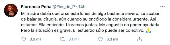 Florencia Peña estuvo en el centro de la polémica de las redes sociales luego de publicar varios tuits que recibió diferentes respuestas de parte de los usuarios de la red social del pajarito. La actriz expresó su preocupación y criticó al sistema de salud por la no atención de su madre, a quien le cancelaron una cirugía oncológica.