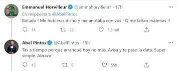 Entre los comentarios, su colega Emmanuel Horvilleur contó que él también debe algunas materias y que si hubiera sabido de su intención, lo hubiera acompañado. “¡Me hubieras dicho y me anotaba con vos! Que me faltan materias!!”, comentó el exintegrante de la banda Illya Kuryaki and the Valderramas. A lo que Abel respondió: “Estás a tiempo porque arranqué hoy nomás. Avisá y te paso la data. Súper simple. Abrazo!”.